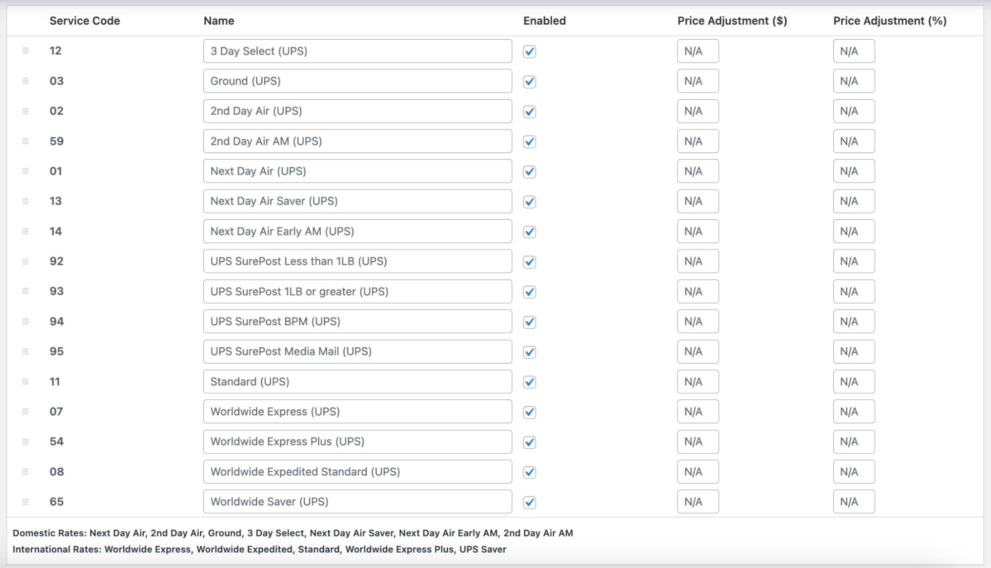 Screenshot showing the available Services to enable on the UPS settings page within a Shipping Zone shipping method