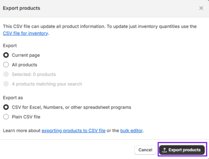 From your Shopify admin, go to Products > Export, then choose the products you want to export (all, selected, current page, or filtered). Select a CSV format compatible with spreadsheet editors like Excel or Google Sheets.- Why It’s useful: This CSV backup contains product titles, descriptions, variants, prices, and inventory. It’s helpful if products are not accidentally deleted when editing in bulk offline or importing them into another platform.