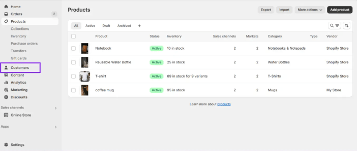 - Export products, customers, and orders via Products > Export, Customers > Export, and Orders > Export in the Shopify admin—see the Shopify Data Export Guide.